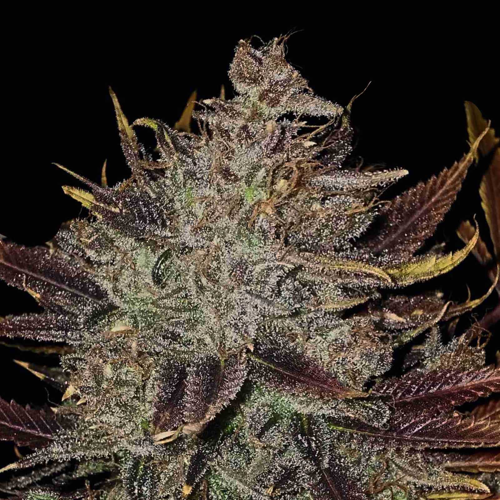 Die Pflanze zeichnet sich durch ihre großen, tiefgrünen Blätter aus, die manchmal in kühleren Temperaturen purpurne Töne annehmen. Ihre Buds sind groß und dicht, bilden lange, kompakte Colas und sind mit einer Schicht aus harzigen Trichomen bedeckt, die ihnen einen fast kristallinen Glanz verleihen. Zusätzlich kontrastieren die orangenen Stigmen, die die Blüten schmücken, wunderbar mit dem Grün und Purpur der Blätter und machen jede Pflanze zu einem echten Spektakel.
